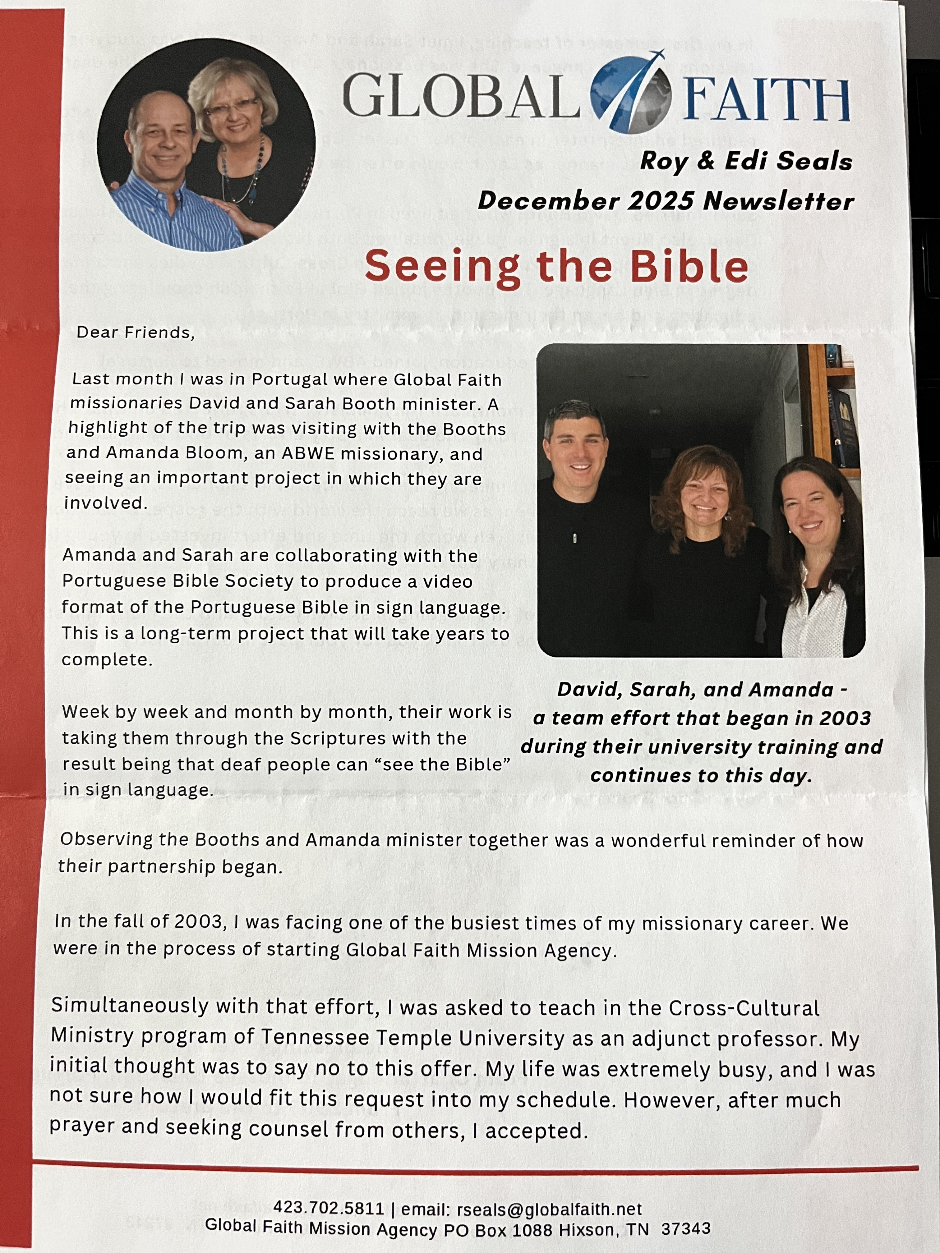 Amanda and Sarah are collaborating with the Portuguese Bible Society to produce a video format of the Portuguese Bible in sign language. This is a long-term project that will take years to complete. Week by week and month by month, their work is David, Sarah, and Amanda - a team effort that began in 2003 taking them through the Scriptures with the during their university training and result being that deaf people can "see the Bible" continues to this day in sign language. Observing the Booths and Amanda minister together was a wonderful reminder of how their partnership began.